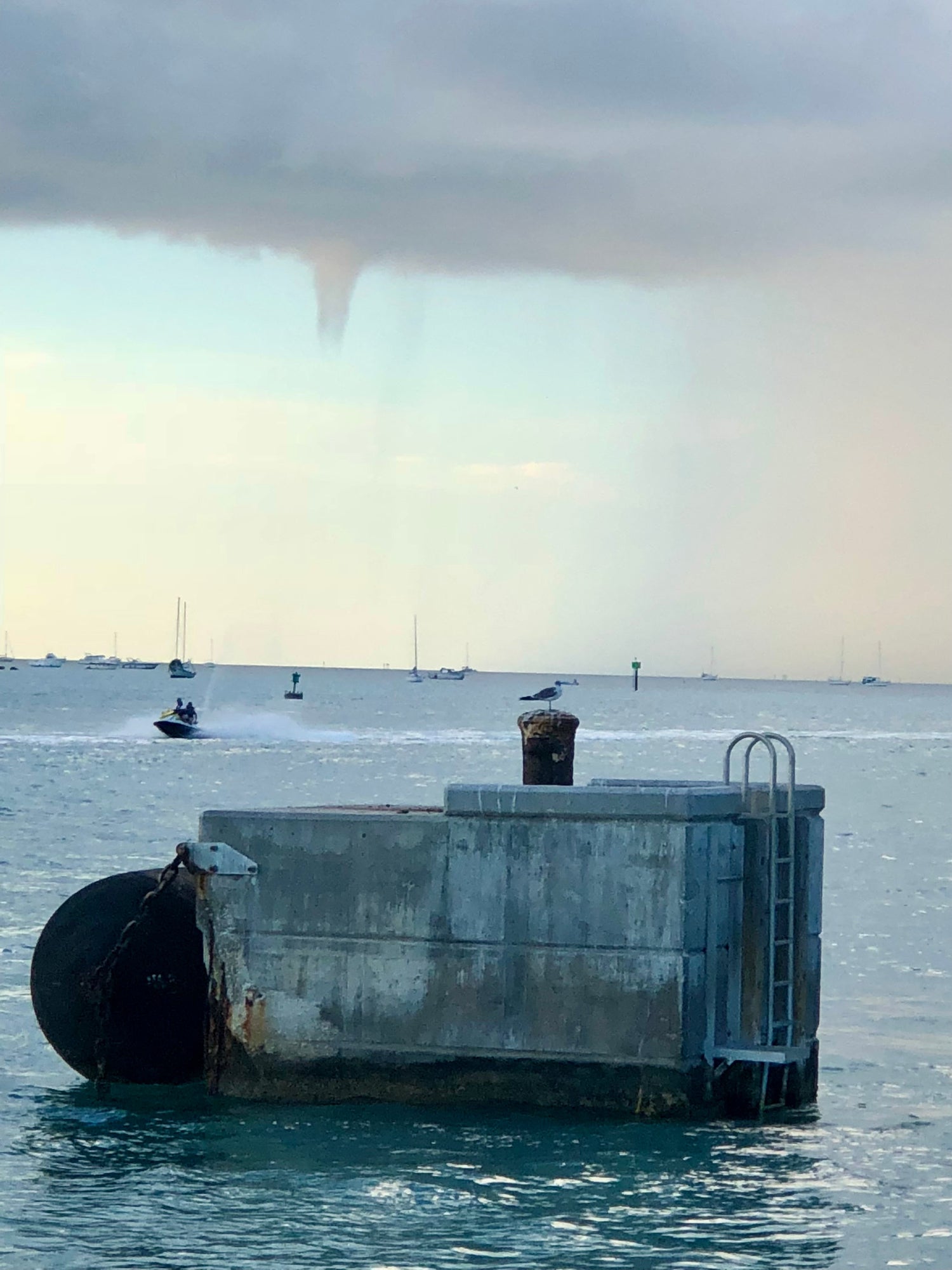 Water Funnel drops down as a storm in Key West interrupts a fun SeaDoo Day while a bird contemplates where he will go next. Nice old concrete pilar in the sea has various colors from many storms while the sun still shines on the crest of the water and a blue sky vs a wall of water represent the beauty and threat of the day.